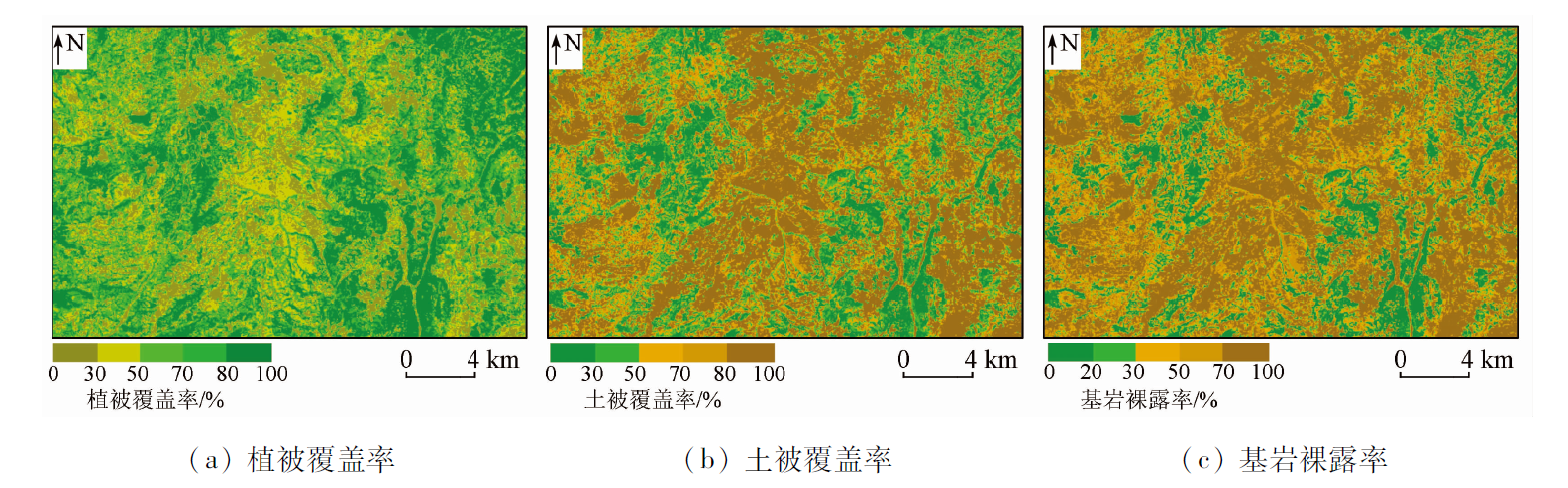 | 图5 Landsat8数据植被覆盖率、土被覆盖率和基岩裸露率 |