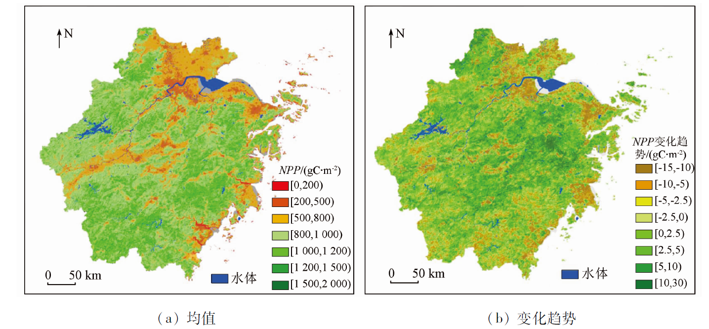 | 图5 2000—2020年浙江省植被NPP均值和变化趋势空间分布 |