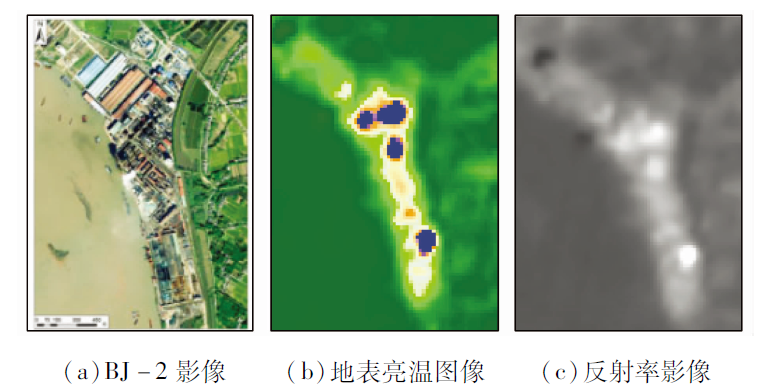 | 图4 BJ-2影像与热异常图、热红外波段反射率图对比 |