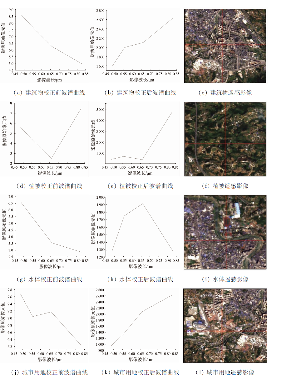 | 图6 大气校正之前后光谱特征及对应地物的遥感影像 |