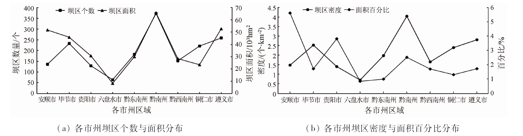 | 图7 各市州坝区数量、面积和密度关系 |