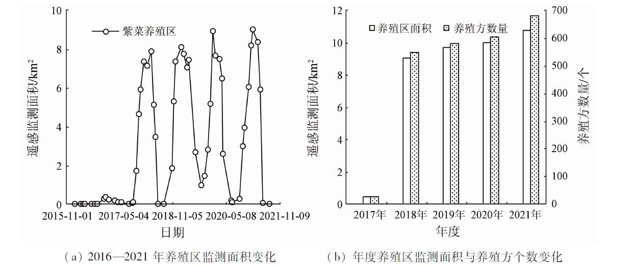| 图6 遥感监测的紫菜养殖区面积与养殖方个数变化 |