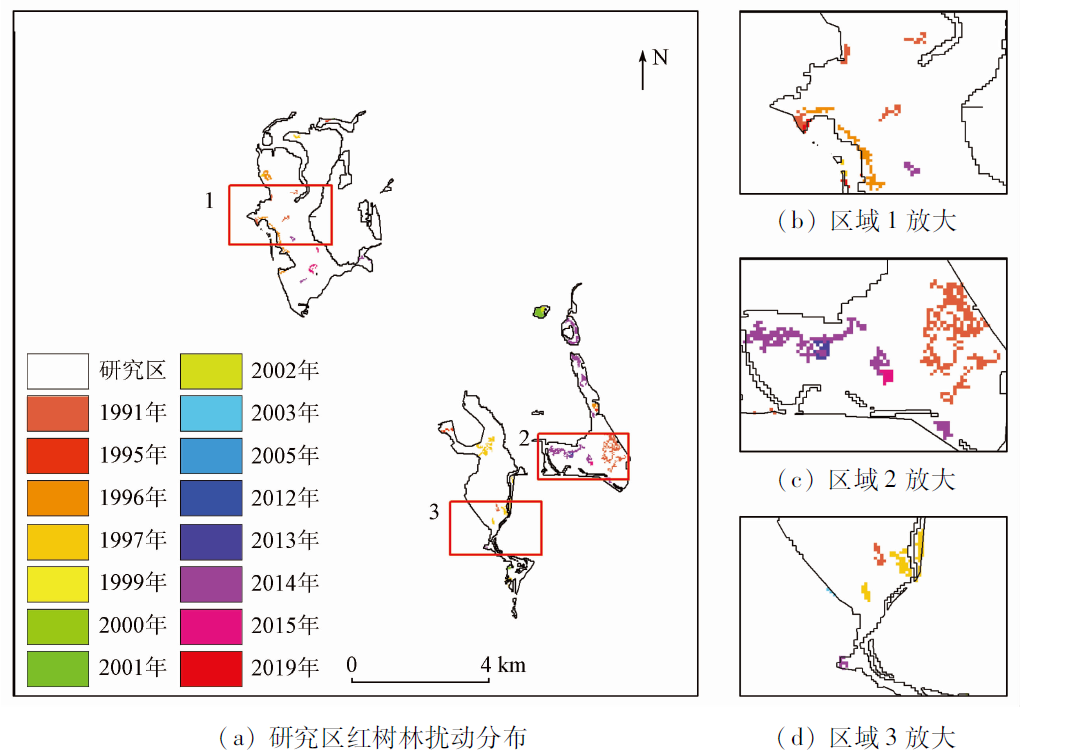 | Fig.6 Temporal and spatial distribution of mangrove forest disturbances in Dongzhaigang Reserve |