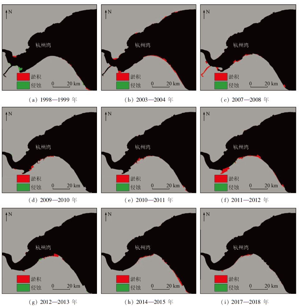 | Fig.5 Staged accretion and erosion areas over the Hangzhou Bay from 1990 to 2019 |