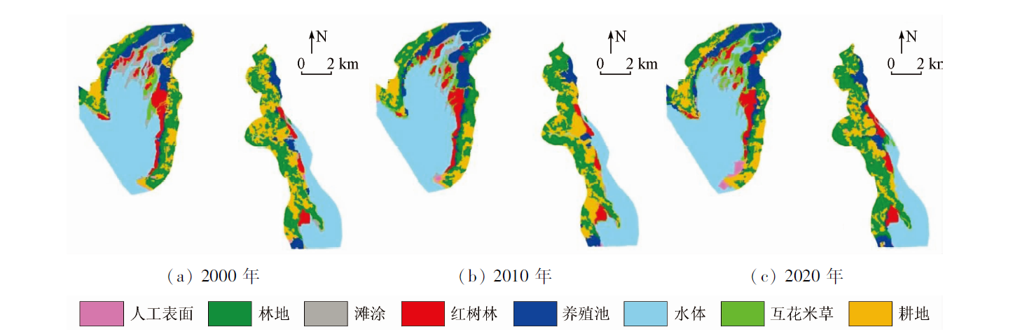 | 图3 2000—2020年研究区红树林及其他土地利用类型分布 |