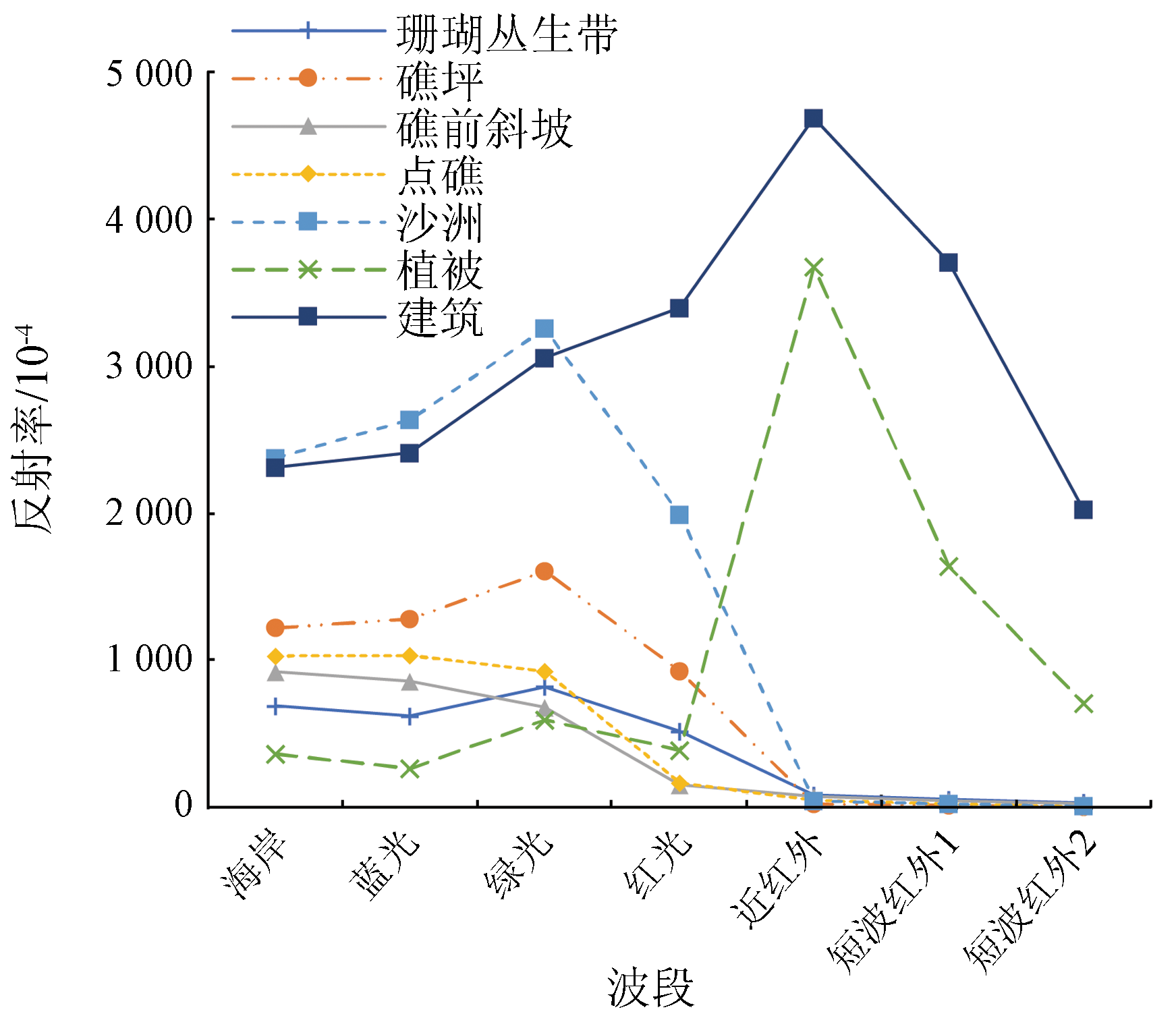 | 图2 珊瑚礁各底质光谱特征曲线 |