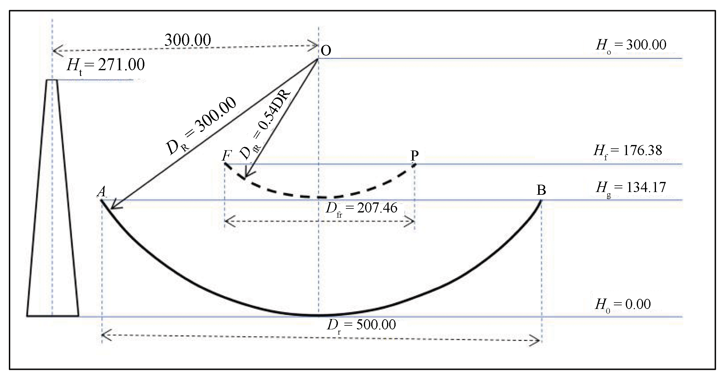 | 图2 FAST望远镜机构简图(m) O: 球心; DR: 球半径; Dr: 球冠开口直径; DfR: 焦面半径; Dfr: 焦面开口直径; H0: 球冠底高程; Hg: 球冠面高程; Hf: 焦面高程; Ho: 球心高; Ht: 支撑塔高程; |