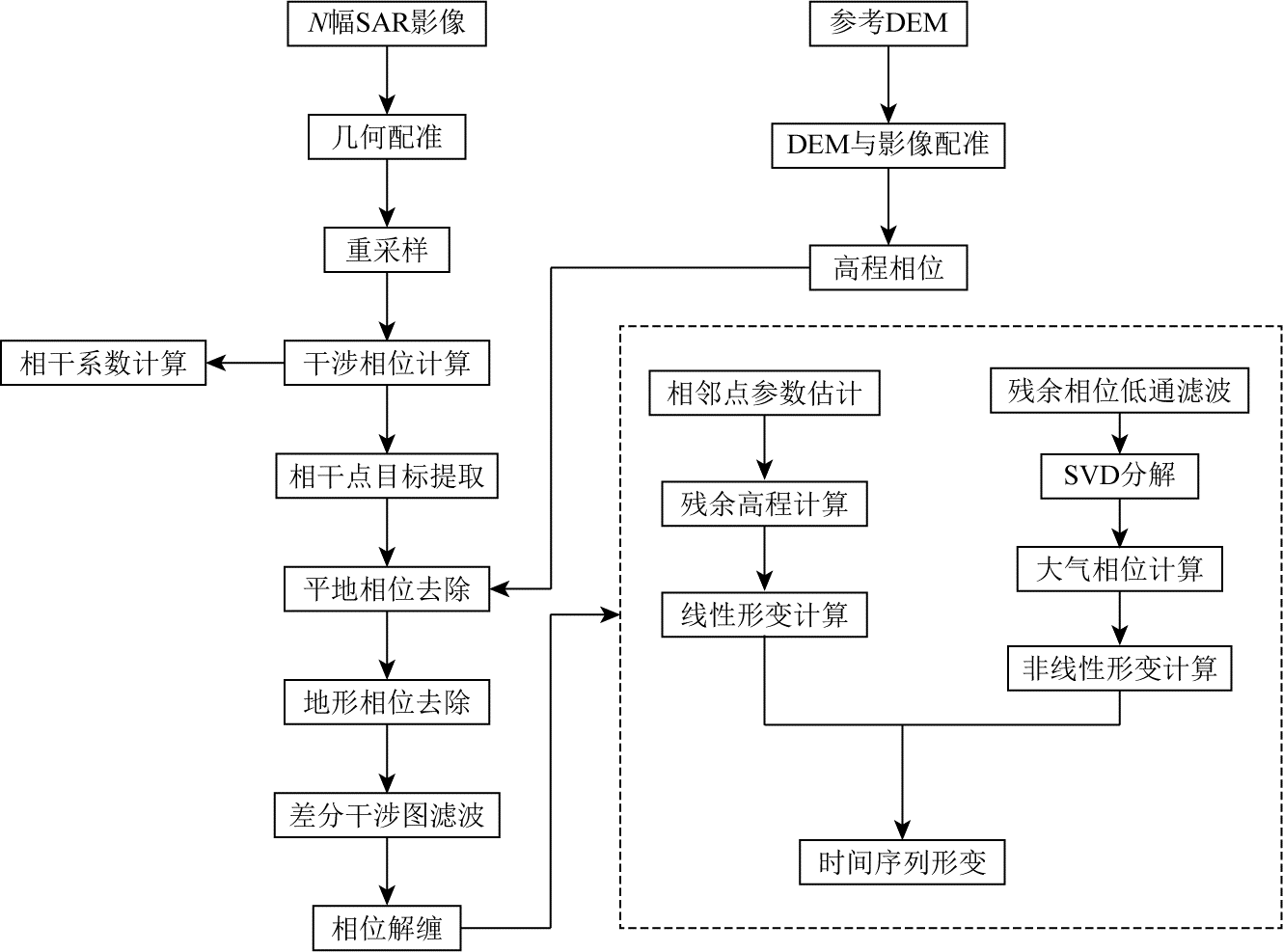 | Fig.2 Flowchart of SBAS-InSAR data processing |