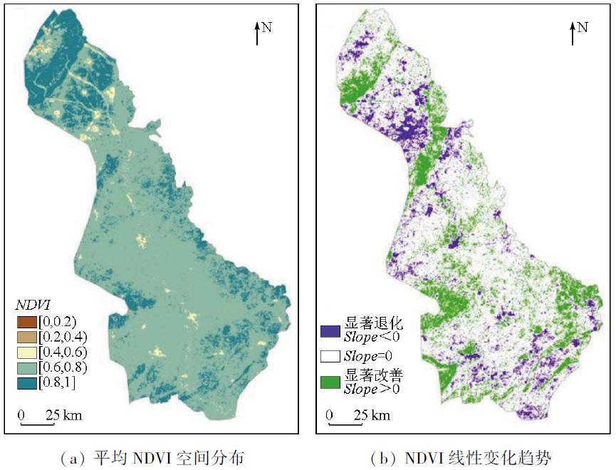 | 图3 2000—2021年沱江流域NDVI空间分布及线性变化趋势 |