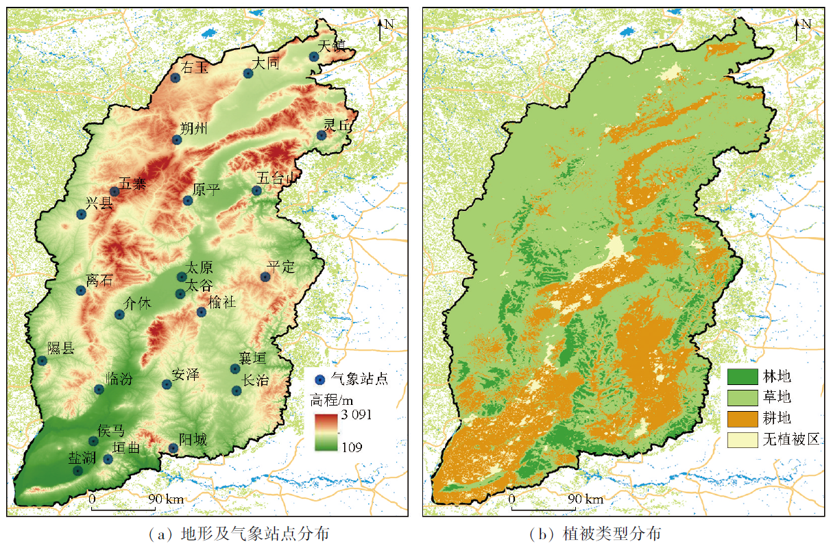| 图1 山西省地形、植被类型及气象站点分布 |