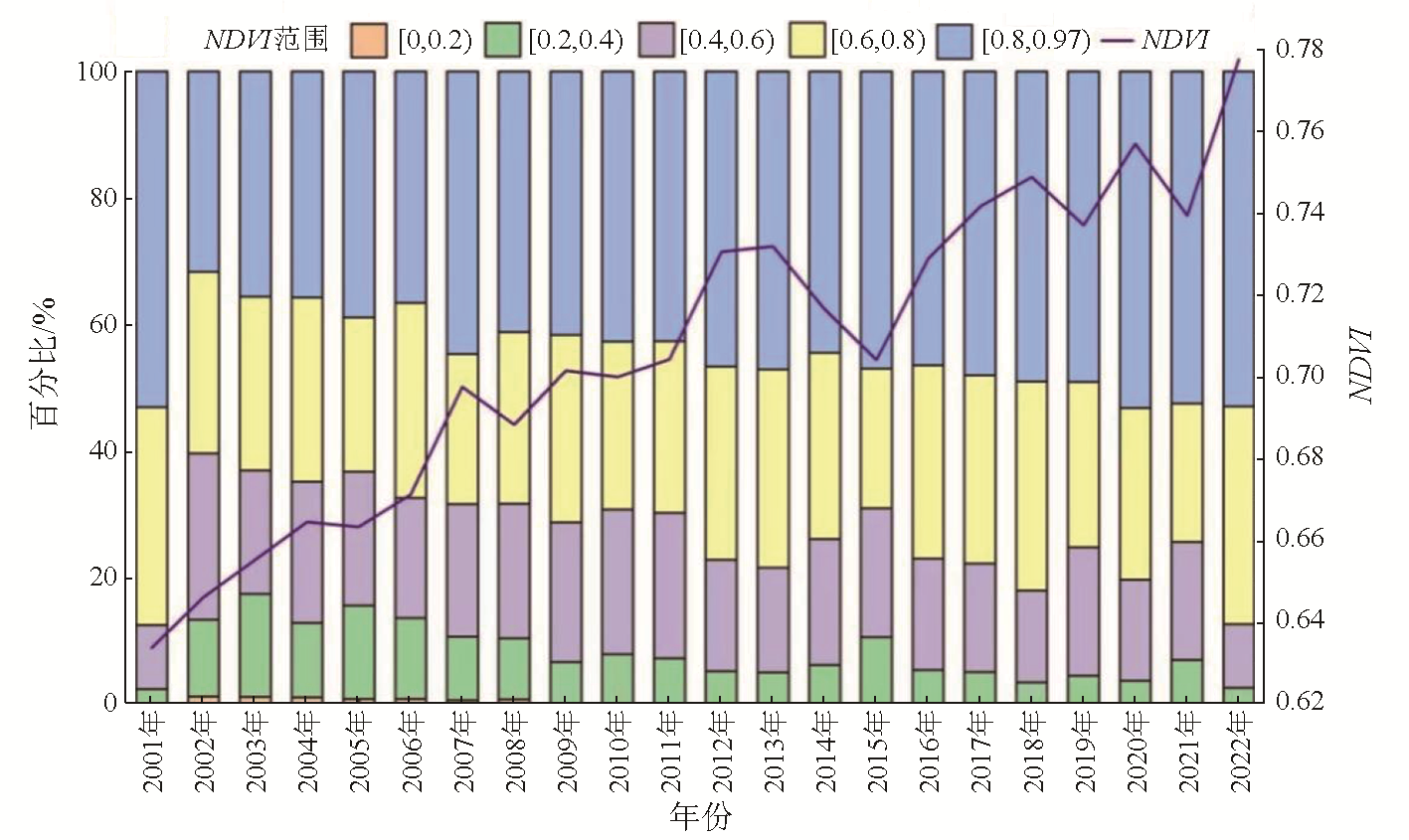 | 图4 2001—2022年陕西省逐年NDVI及其不同等级面积比例变化 |