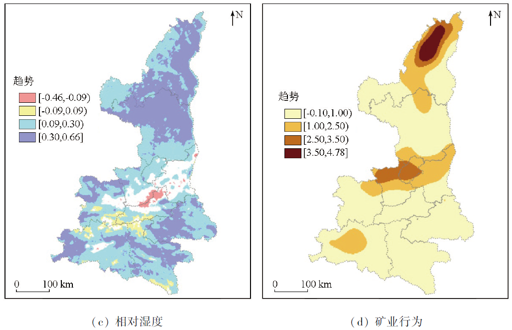 | Fig.6-2 Spatial patterns of trend coefficients of annual temperature, precipitation, humidity and mining activity from 2001 to 2020 of Shaanxi Province |