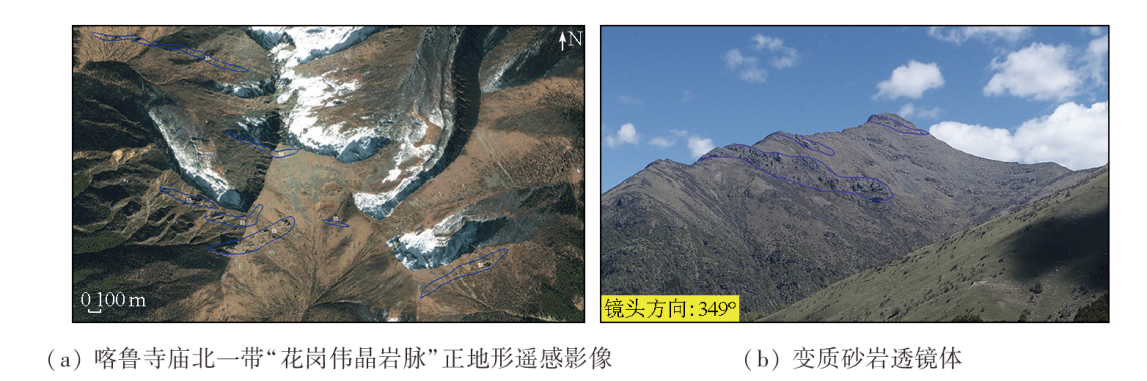 | 图8 喀鲁寺庙北一带花岗伟晶岩脉解译及野外验证 |