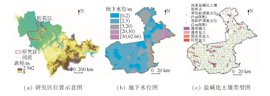 | 图1 研究区位置和盐碱化土壤类型、地下水位图 |