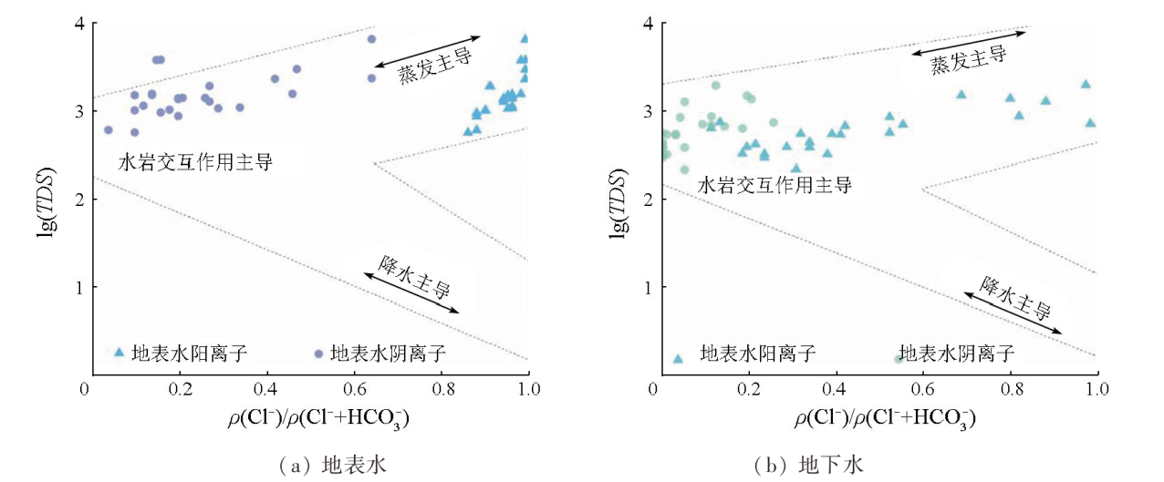 | 图7 地表水和地下水盐分离子Gibbs图 |