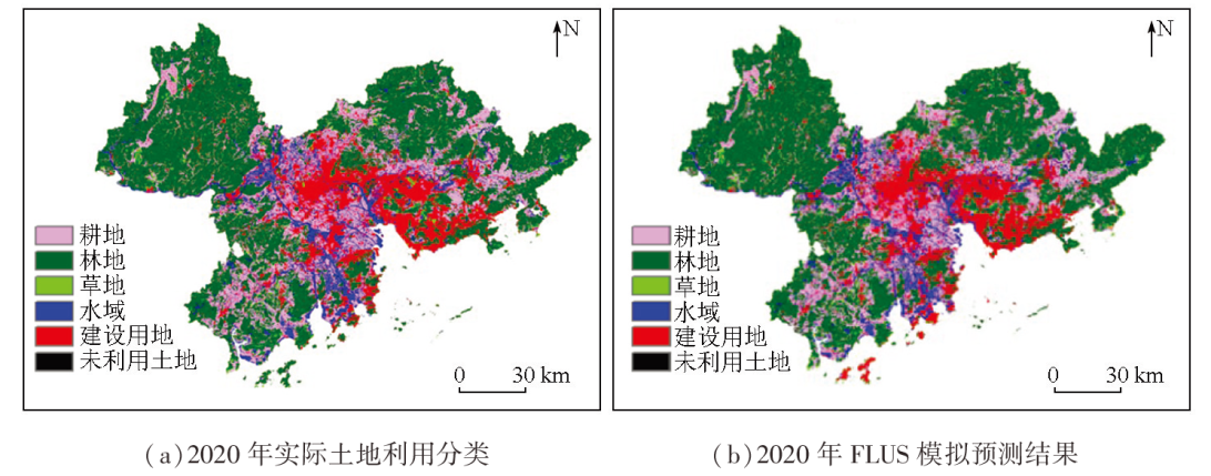 | 图3 珠三角城市群2020年土地利用现状及模拟结果 |