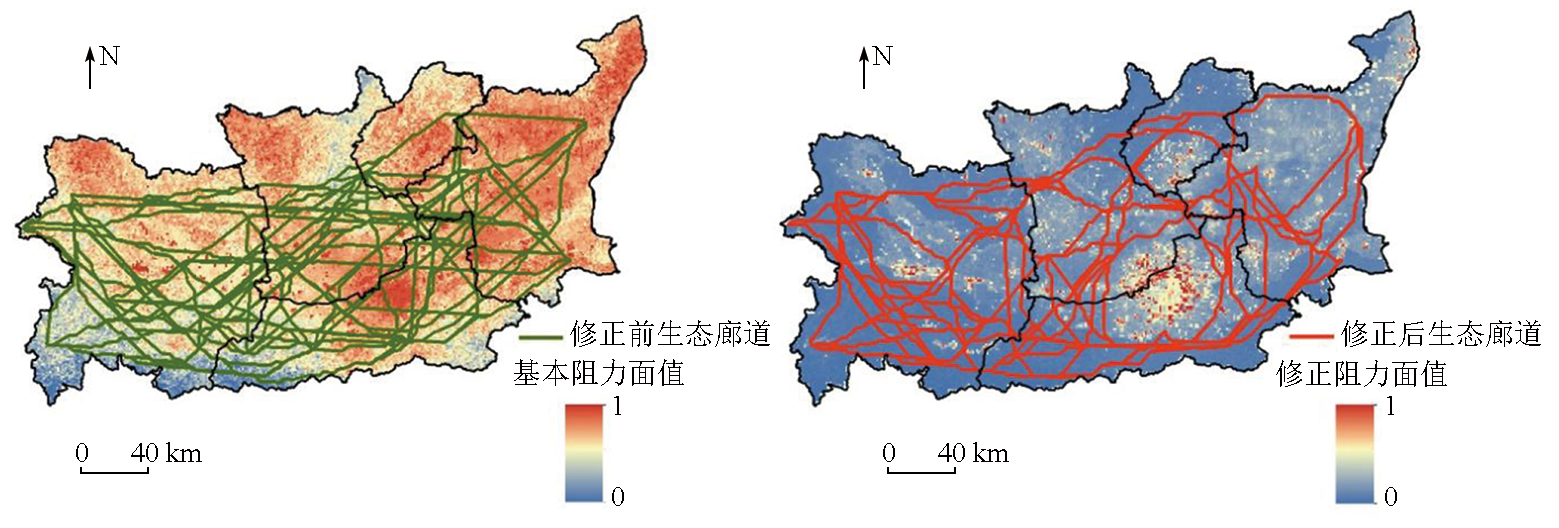 | 图5 关中平原阻力面修正前后生态廊道图 |