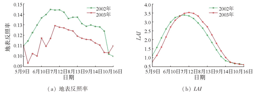 | 图3 森林火灾发生前后年份(2002年和2003年)火烧迹地非积雪覆盖期地表反照率和LAI随时间变化 |