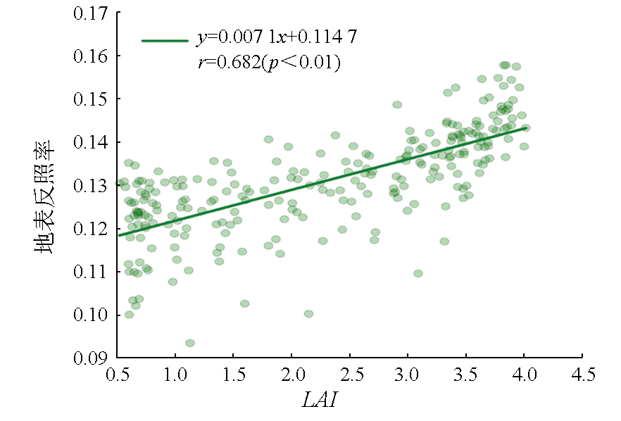 | Fig.7 Correlation between surface albedo and LAI during non-snow cover period from 2002 to 2013 |