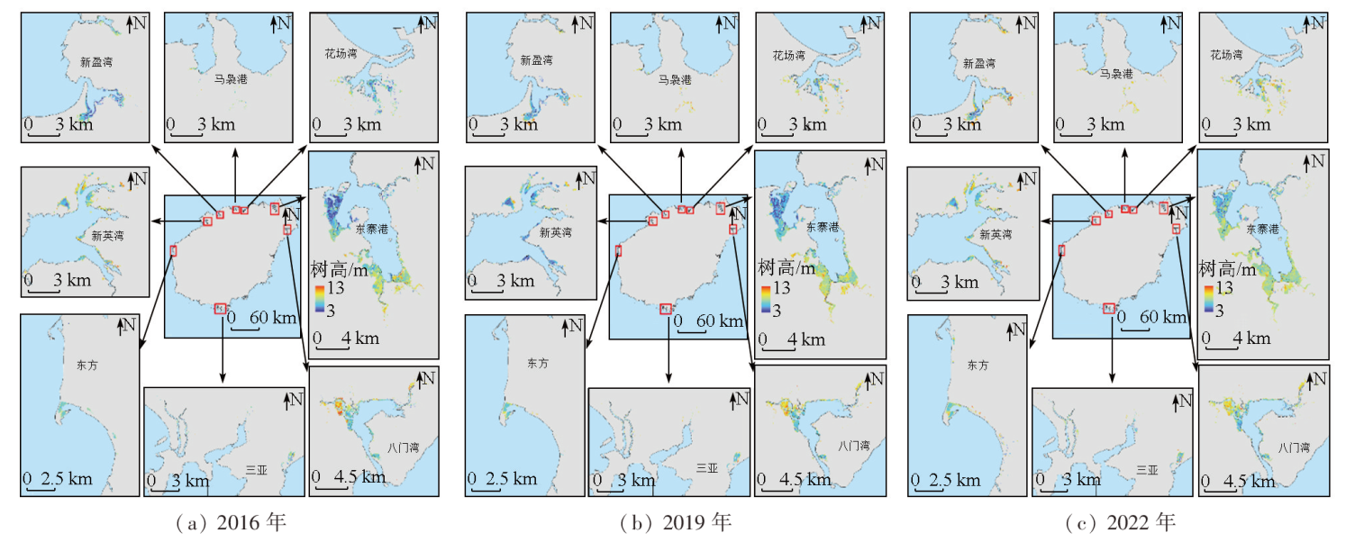 | 图4 海南岛红树林主要分布区域2016年、2019年、2022年红树林树高分布 |