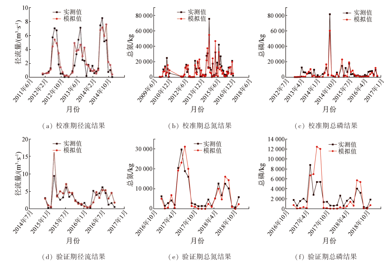| 图4 径流、总氮、总磷校准期和验证期实测值和模拟值拟合结果 |