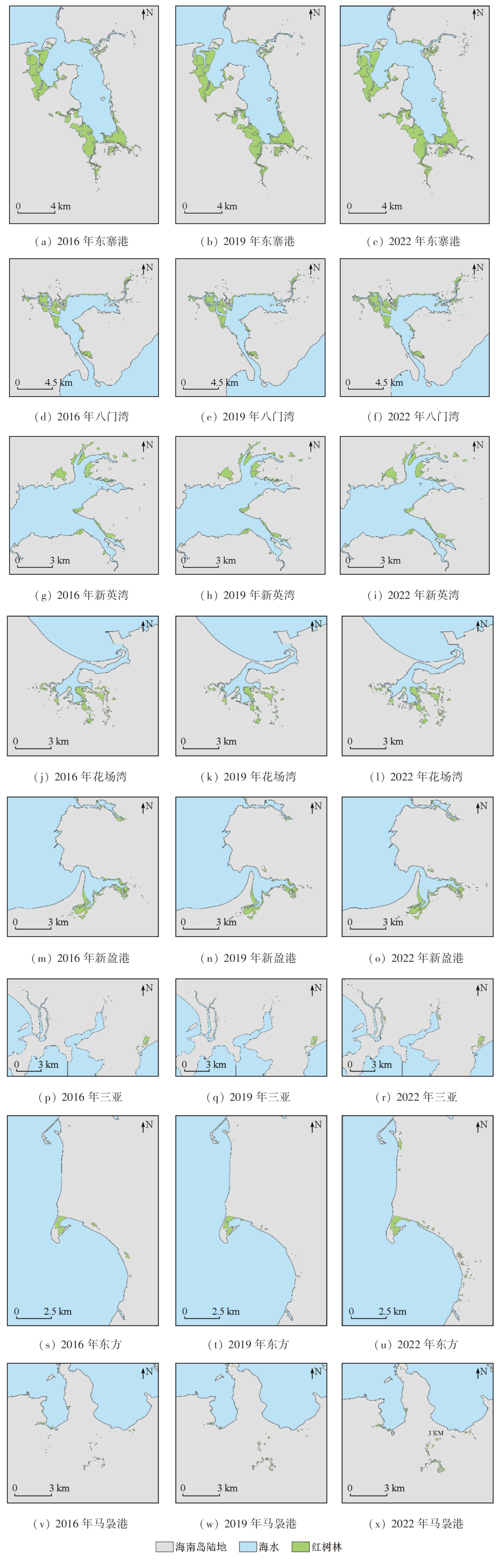 | 图3 海南岛重点区域2016年、2019年、2022年红树林分布 |