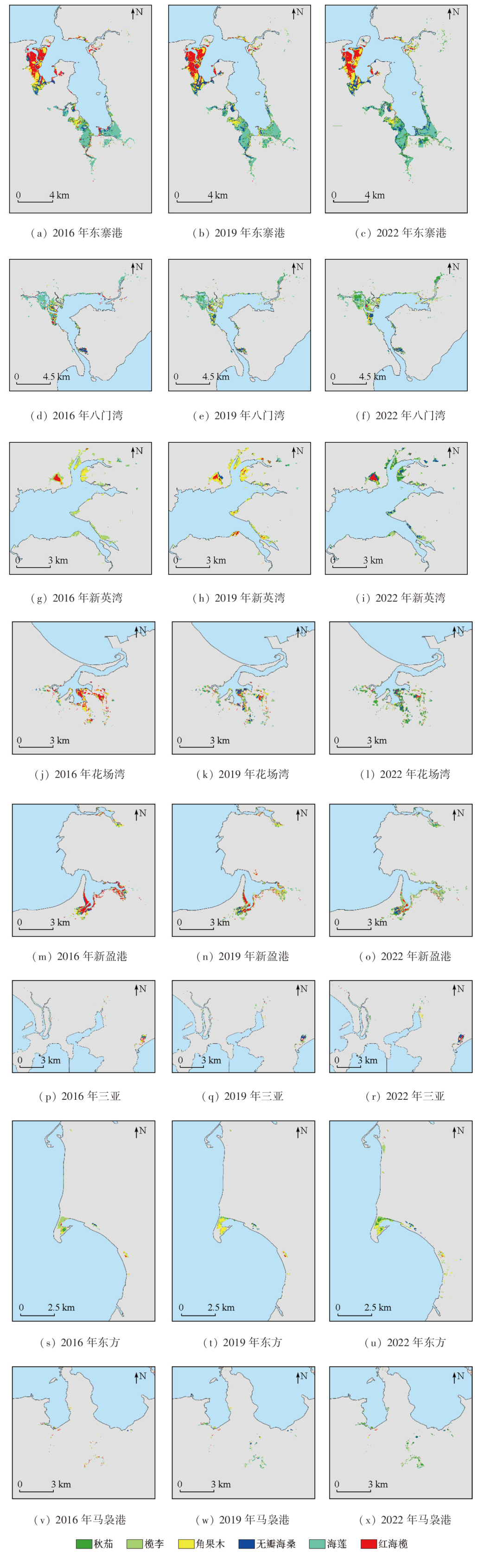 | 图6 海南岛重点区域2016年、2019年、2022年红树林树种分布 |