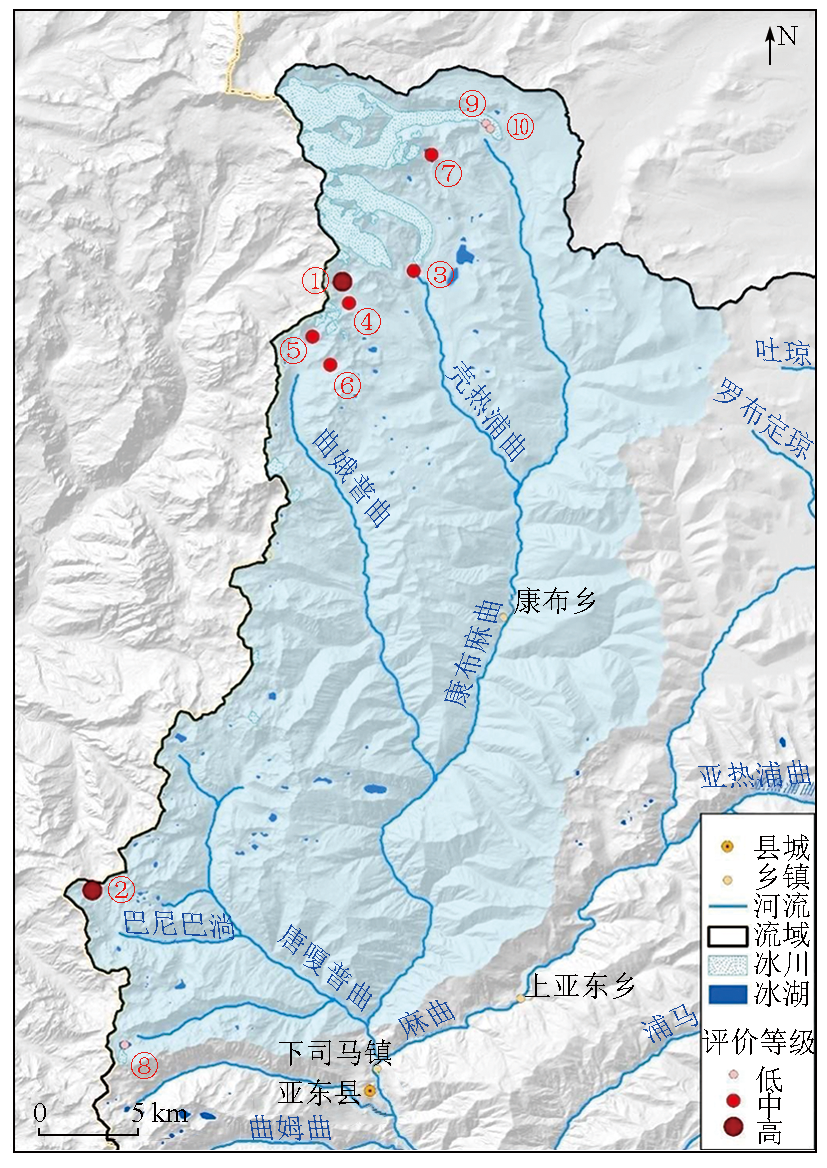 | 图4 康布麻曲流域不同危险等级冰湖分布 |