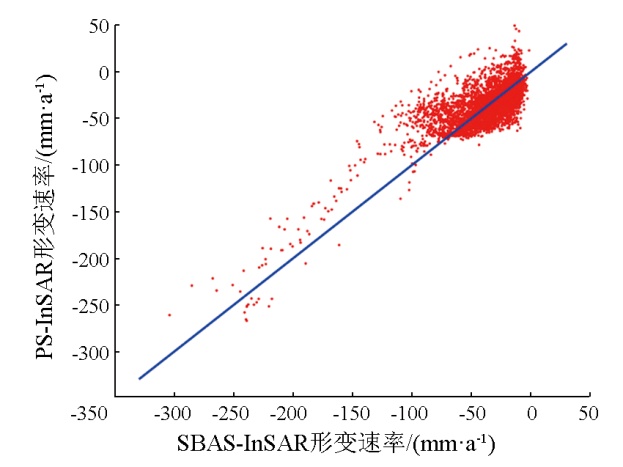 | 图5 SBAS-InSAR与PS-InSAR监测形变速率相关性 |