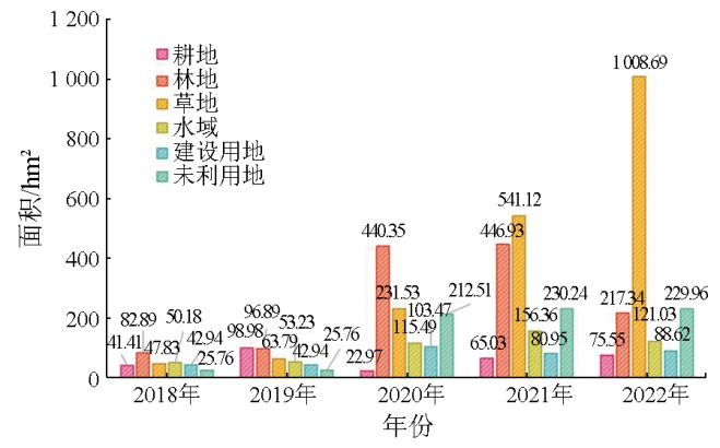 | 图10 研究区2018—2022年废弃露天矿山生态修复治理后地类面积统计图 |