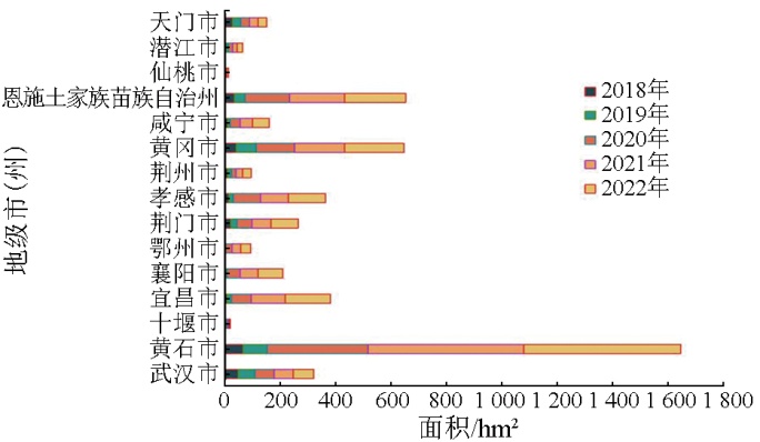 | 图11 研究区各地级市(州)2018—2022年废弃露天矿山生态修复治理面积统计 |