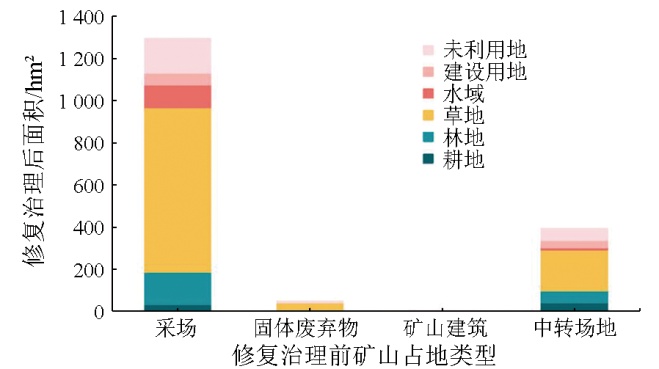 | Fig.13 Area of land types before and after ecological restoration and teatment of abandoned open-pit mines in the study area in 2022 |
