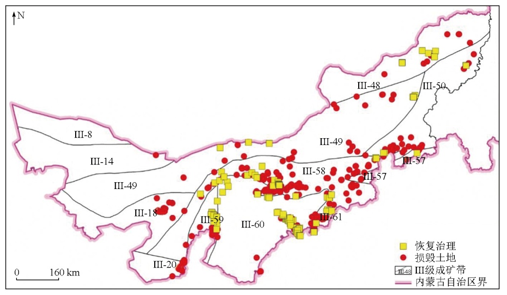 | Fig.3 Remote sensing monitoring map of newly mined and rehabilitation land in west-central Inner Mongolia in 2021 |
