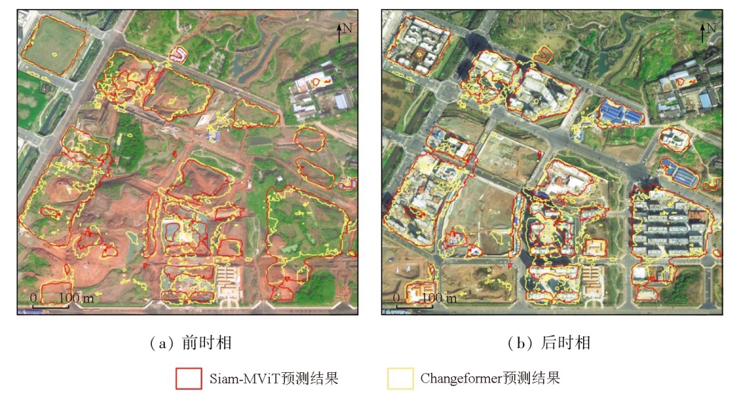 | 图7 Siam-MViT与Changeformer在SAMPLE-CD数据集上大尺度预测结果对比 |
