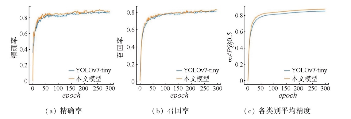 | 图7 YOLOv7-tiny改进前后的精确率、召回率和mAP曲线 |