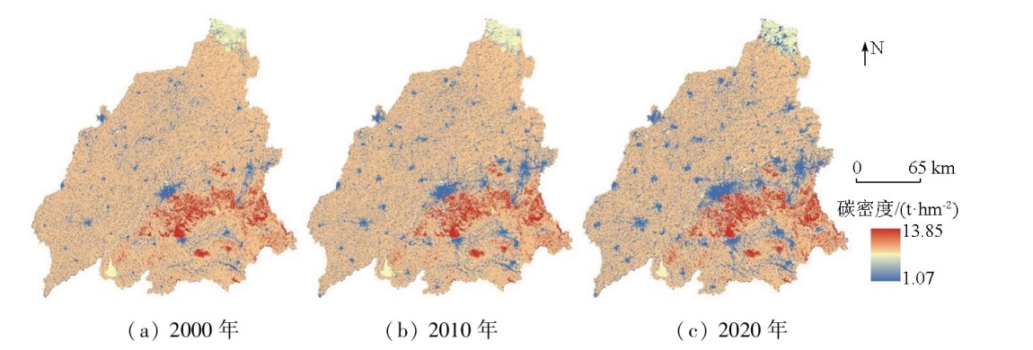 | Fig.4 Distribution of carbon density in Jinan metropolitan circle from 2000 to 2020 |