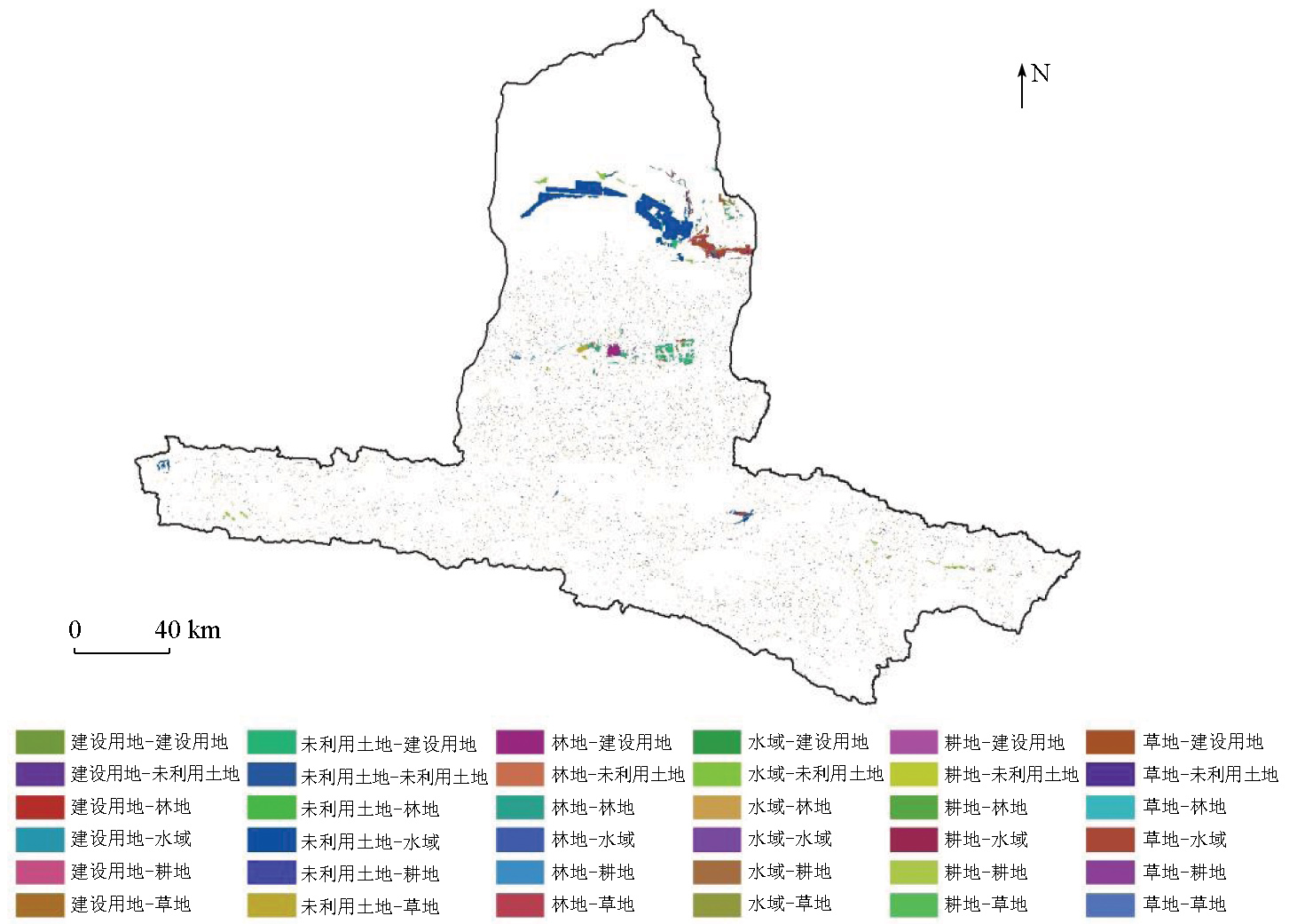 | 图5 1980—2020年格尔木河流域土地利用转移空间分布图 |