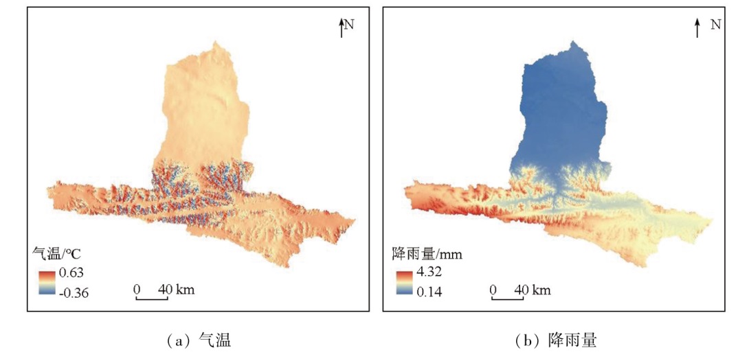 | 图8 格尔木河流域气温和降雨量变化趋势空间分布图 |