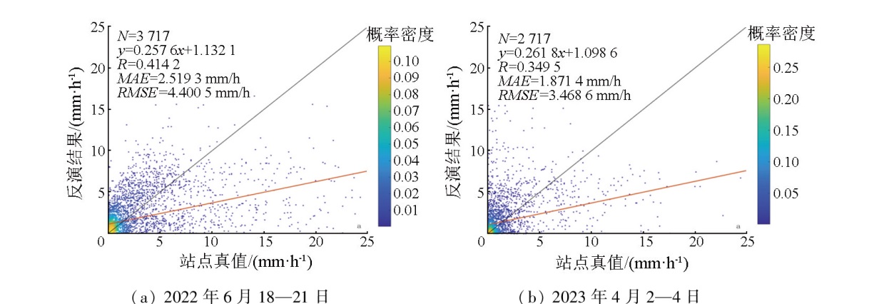 | 图7 2个降水个例反演所得降水与站点真值拟合概率密度散点图(升轨) |