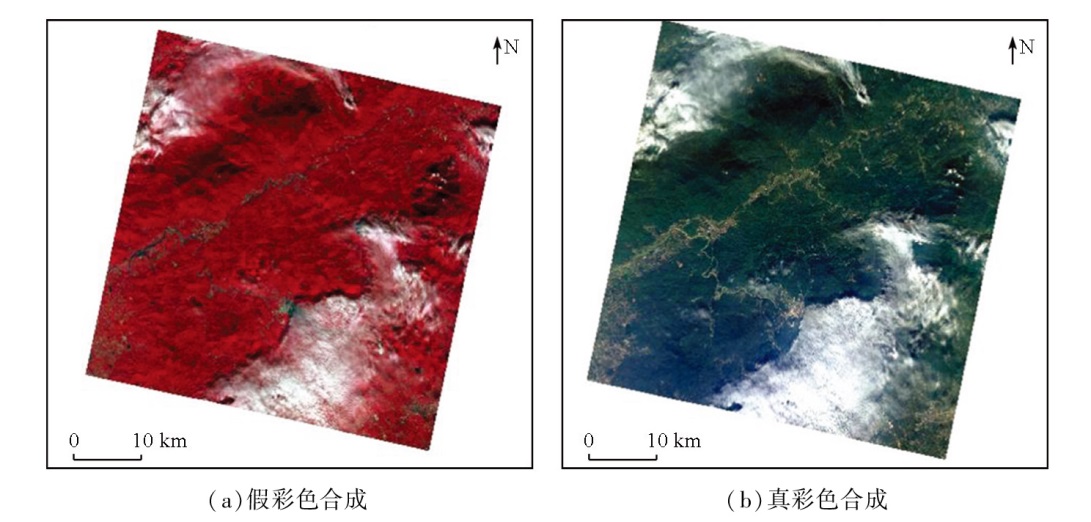| 图2 研究区珠海一号卫星高光谱假彩色和真彩色影像 |