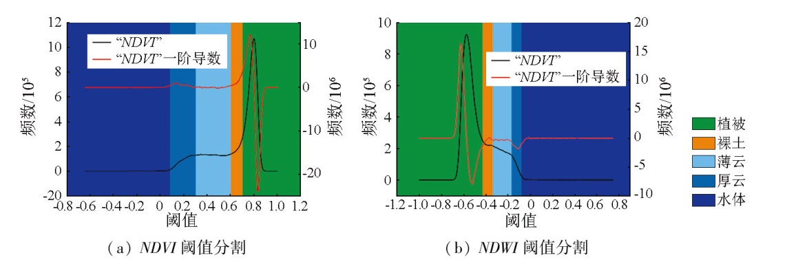 | 图4 基于NDVI和NDWI直方图阈值及其分割图像 |