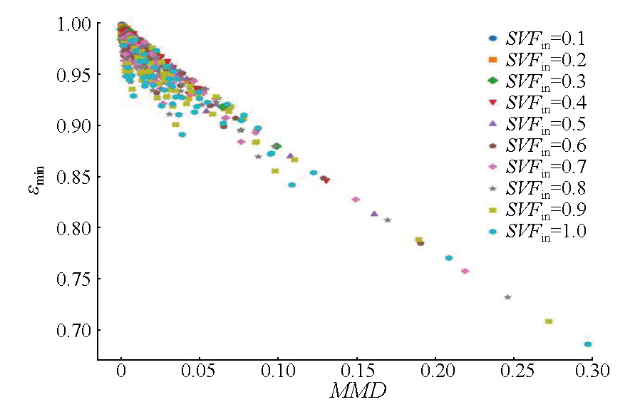 | Fig.3 Scatterplot of εmin and MMD with different SVFin values |