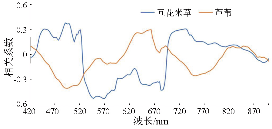 | 图5 互花米草和芦苇在不同波长值下植物生物量相关系数图 |