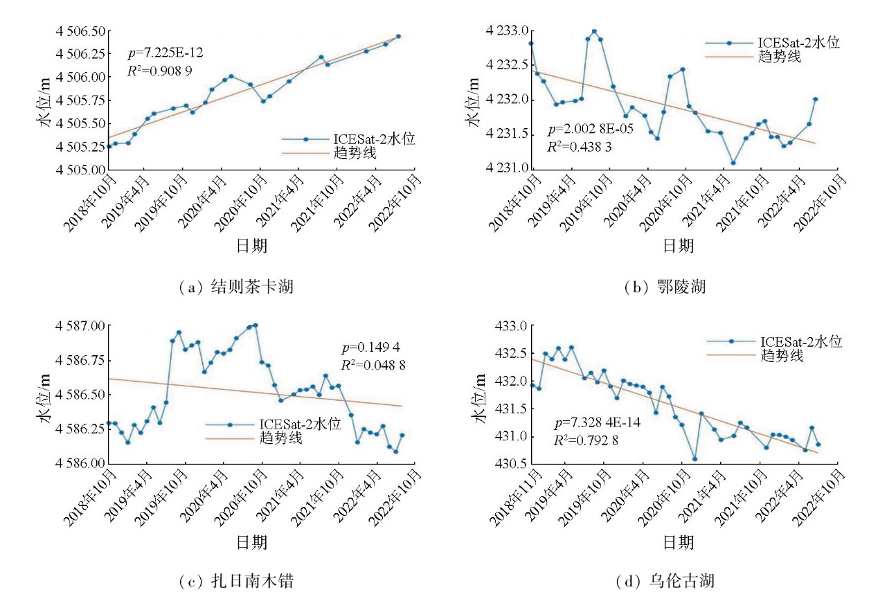 | Fig.12 Changes in water levels of typical lakes from ICESat-2 data |