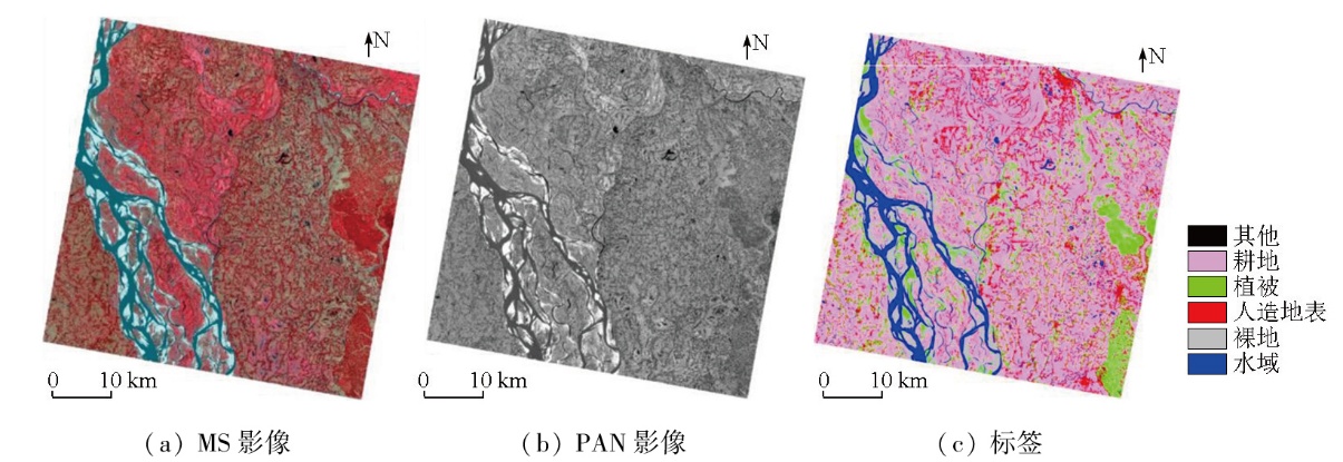 | 图1 数据集中的MS影像、PAN影像和标签示例 |