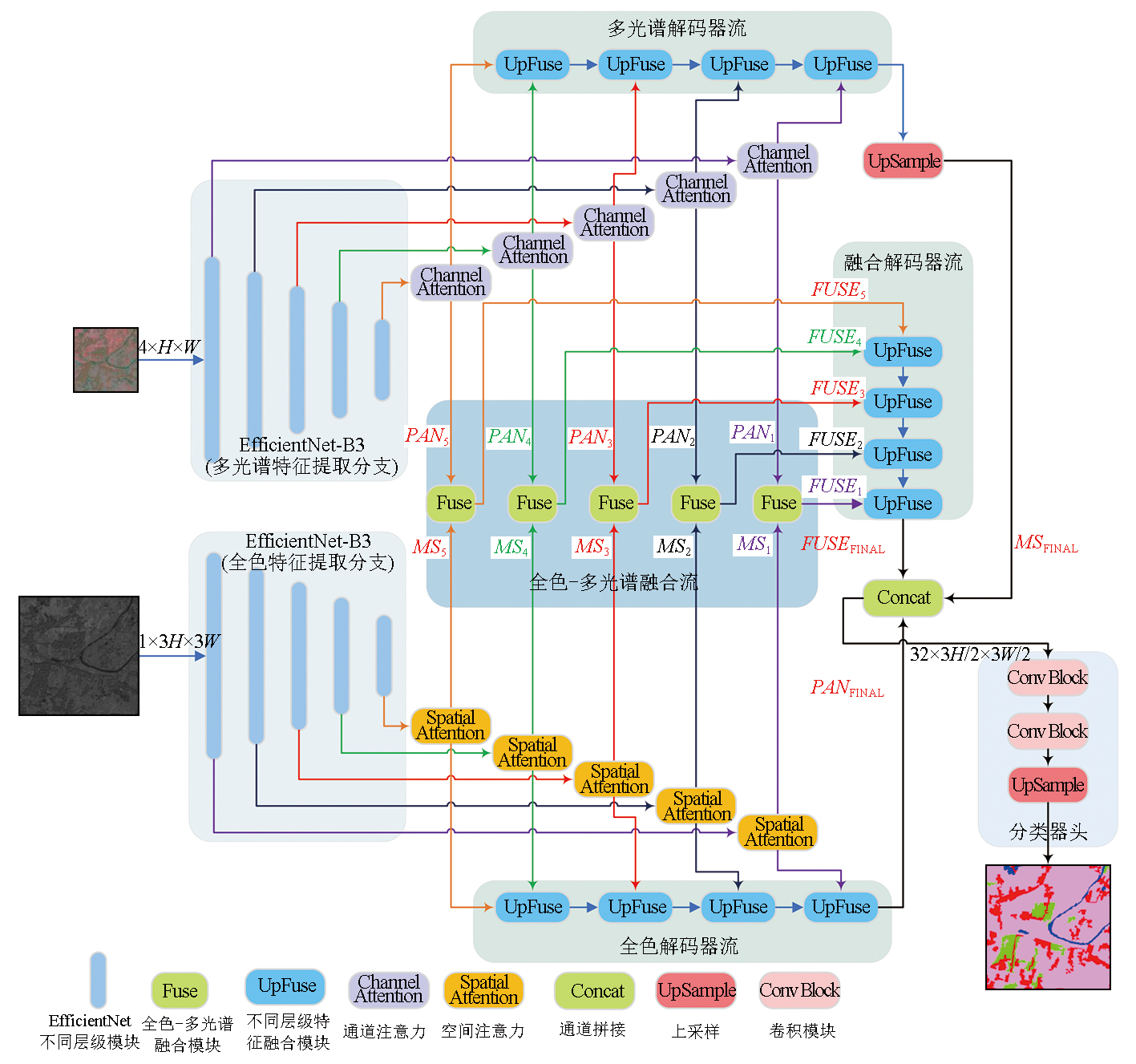 End-to-end land cover classification based on panchromatic-multispectral dual-stream convolutional network |
