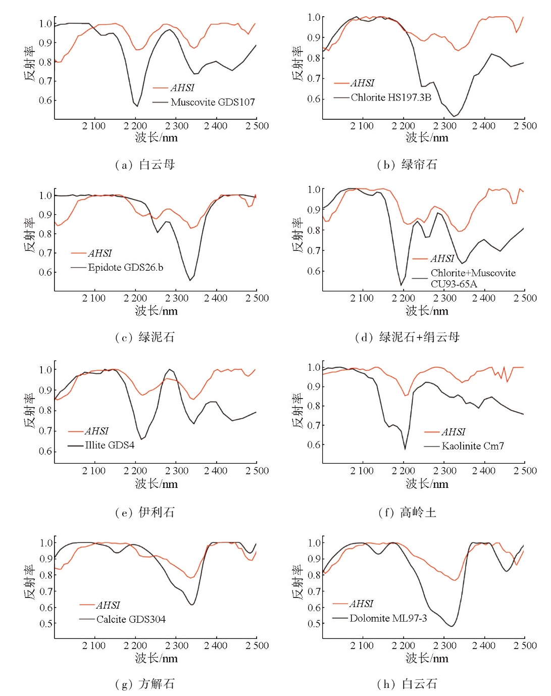 | 图8 典型矿物ZY1-02D AHSI影像光谱与USGS光谱库参考光谱对比 |