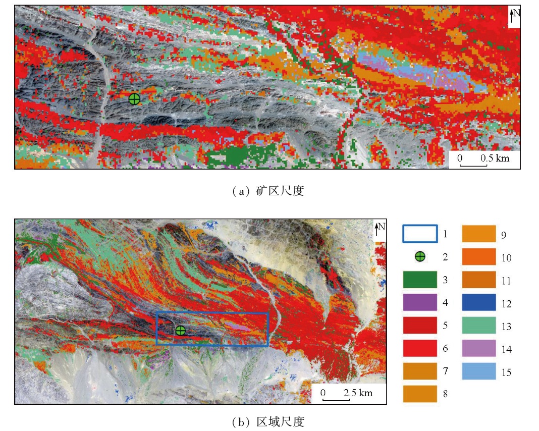 | 图9 前红泉地区高光谱遥感蚀变矿物分布图 1. 前红泉金矿及周边地区位置;2.前红泉金矿;3.方解石;4.白云石;5.绿帘石;6.绿泥石;7.低铝白云母;8.中铝白云母;9.高铝白云母;10.富铁白云母;11.伊利石;12.高岭石;13.蒙脱石;14.针铁矿;15.褐铁矿 |