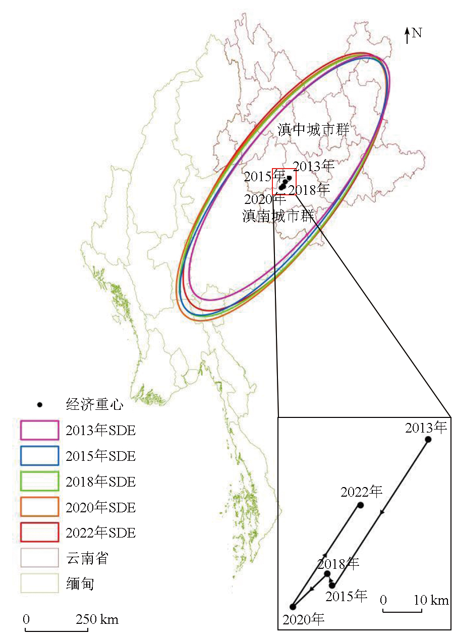 | 图6 2013—2022年研究区域SDE和经济重心 (审图号:GS京(2025)1936号) |