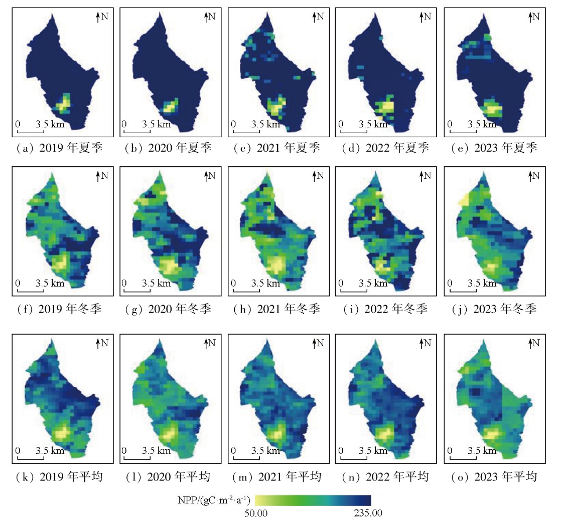 | 图6 研究区2019—2023年NPP夏季、冬季、年均分布格局 |